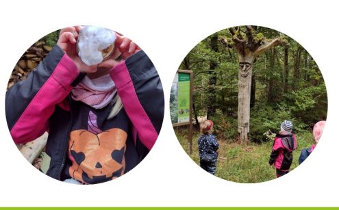 Ebenso spannend war es für die kleinen Wanderer jedoch, den Wald zu erkunden. Gab es doch überall etwas zu entdecken oder zu bestaunen! Dort ein Baumstamm zum Balancieren, ein Stück weiter verschiedene Pilze, nebenan ein Miniweiher… sogar ein Frosch kreuzte unseren Weg.