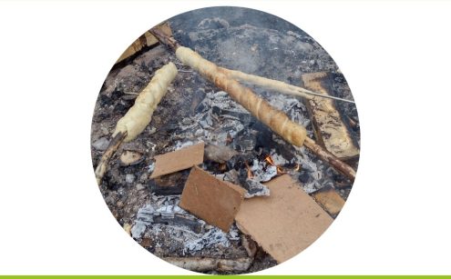 Zum Abschluss gab es dann die ersehnten Baumstriezel, selbst gebacken überm Lagerfeuer – auf traditionelle Art an einem dicken Rundholz und, damit es schneller ging, auch als Variante am Stock wie beim Stockbrot. Egal welche Variante, die Baumstriezel schmeckten so was von lecker mit der Zuckerkruste außen herum, dass die große Teigschüssel bis auf das letzte Fitzelchen Teig geleert wurde.