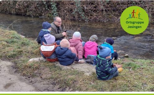 Der Winter hält nicht nur uns auf Trab aktuell, sondern auch unsere heimische Vogelwelt. Gemeinsam mit Klaus Lang vom NABU Teck machten sich sieben Familien am 1. Februar 2026 auf einen Spaziergang entlang der Lindach. Dort wurde die Jesinger Vogelwelt kindgerecht erkundet. Ein Glück, dass wir die Stockenten zum richtigen Zeitpunkt beim Schwimmen beobachten konnten. Dabei wurde erklärt, warum die Vögel im Gegensatz zu uns keine kalten Füße bekommen können! Und wir testeten natürlich auch die Wassertemperatur mit den Händen. Ganz schön kalt, waren sich alle einig! Aber trotzdem sehr sauber – die Lindach ist heute ein sehr geschätztes Bächlein bei Tieren und Pflanzen.