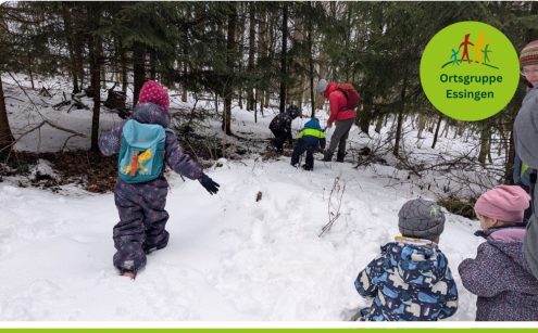 Was machen der Fuchs und seine Tierfreunde im Winter, um nicht zu frieren? Holen sie sich eine Wärmflasche, trinken Tee oder ziehen sich eine warme Jacke an? Nein, natürlich nicht. Aber wie halten sie sich dann warm? Genau das wollten fünf Familien am 1. Februar bei einem Winterspaziergang der Familiengruppe Essingen am Teußenberg herausfinden.